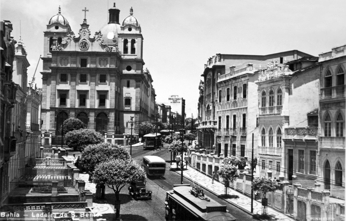 Fotografia antiga da Ladeira de São Bento, com o velho casario que infelizmente sucumbiu ao crescimento desordenado da cidade