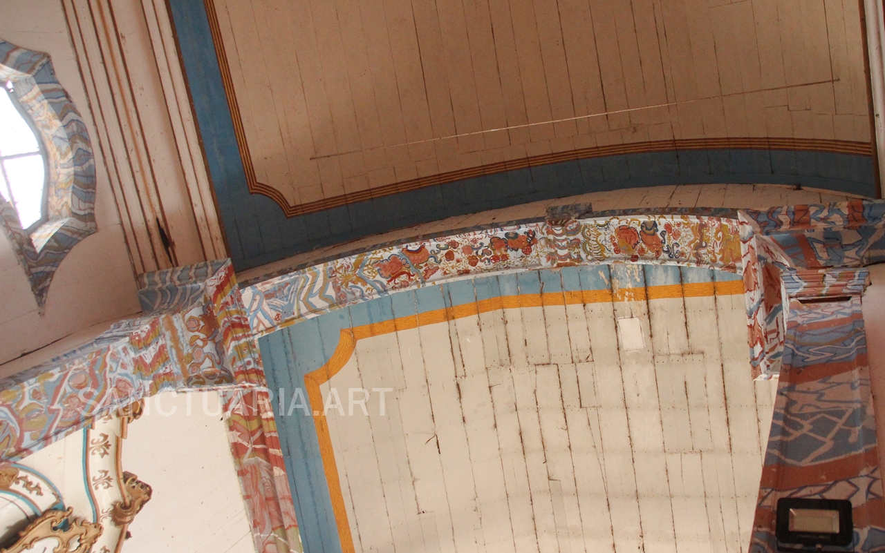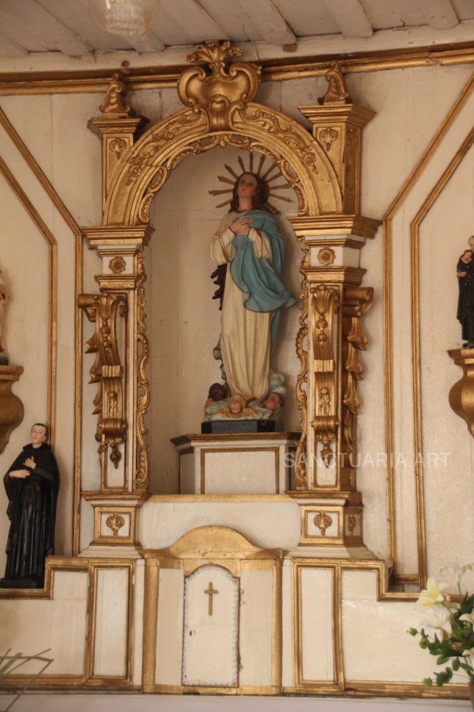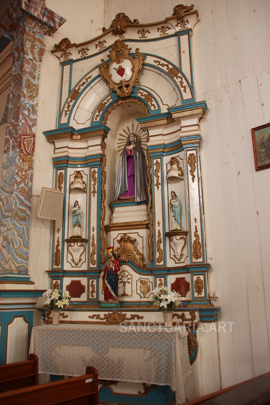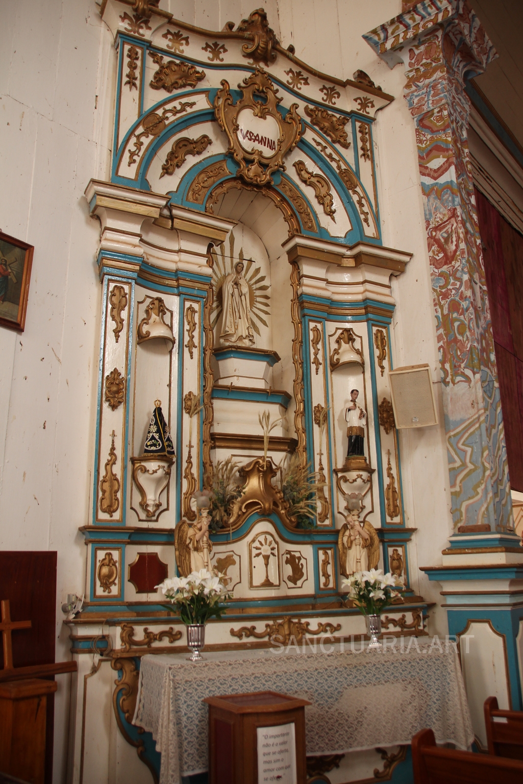 Como habitualmente na região, há uma cimalha que atravessa a capela-mor, unindo o arco-cruzeiro com o retábulo principal.