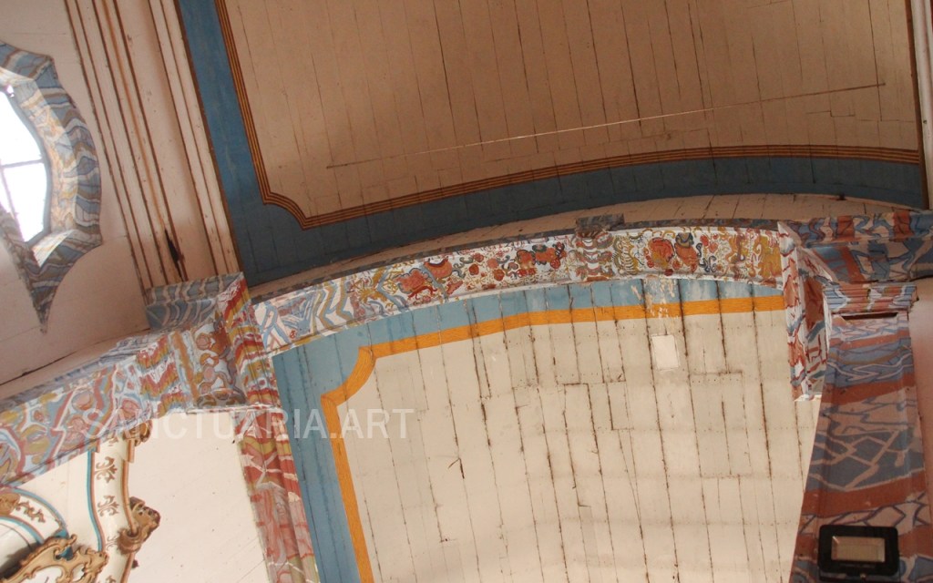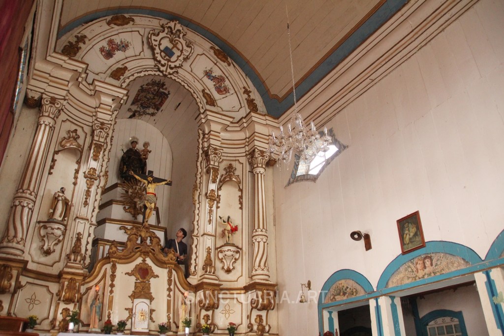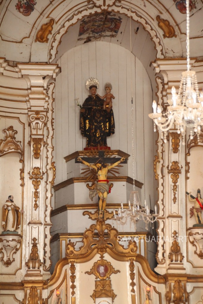 O forro da capela-mor traz pintura com a cena do sermão de Santo Antonio aos peixes.