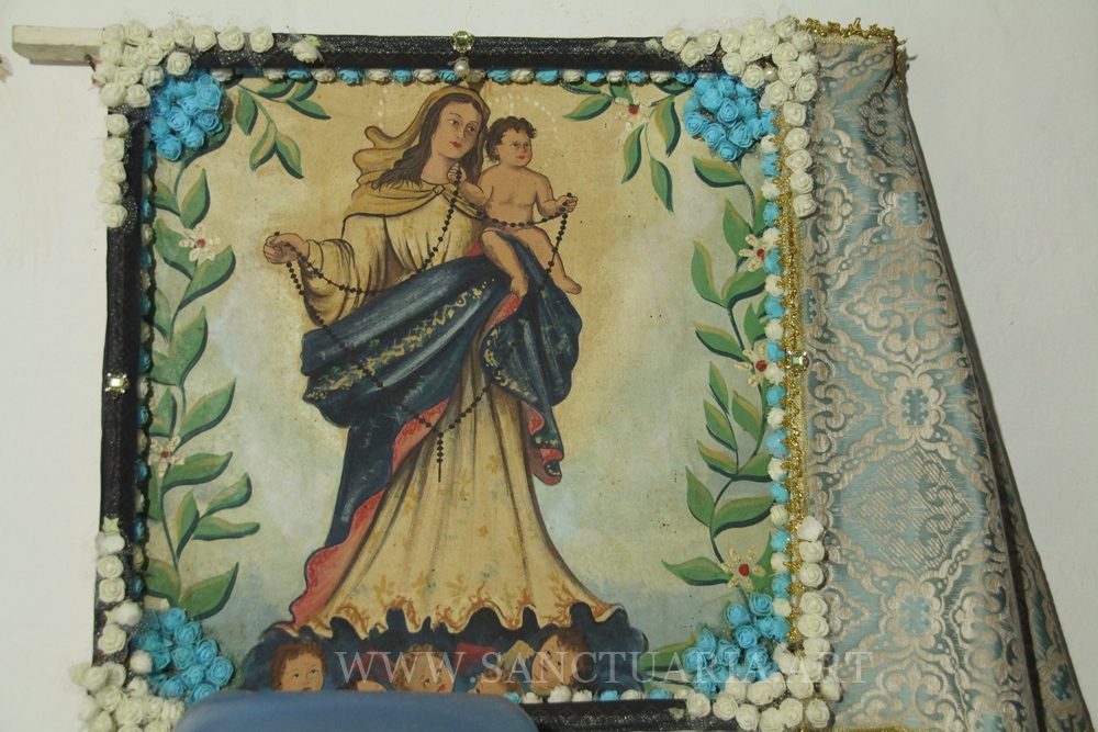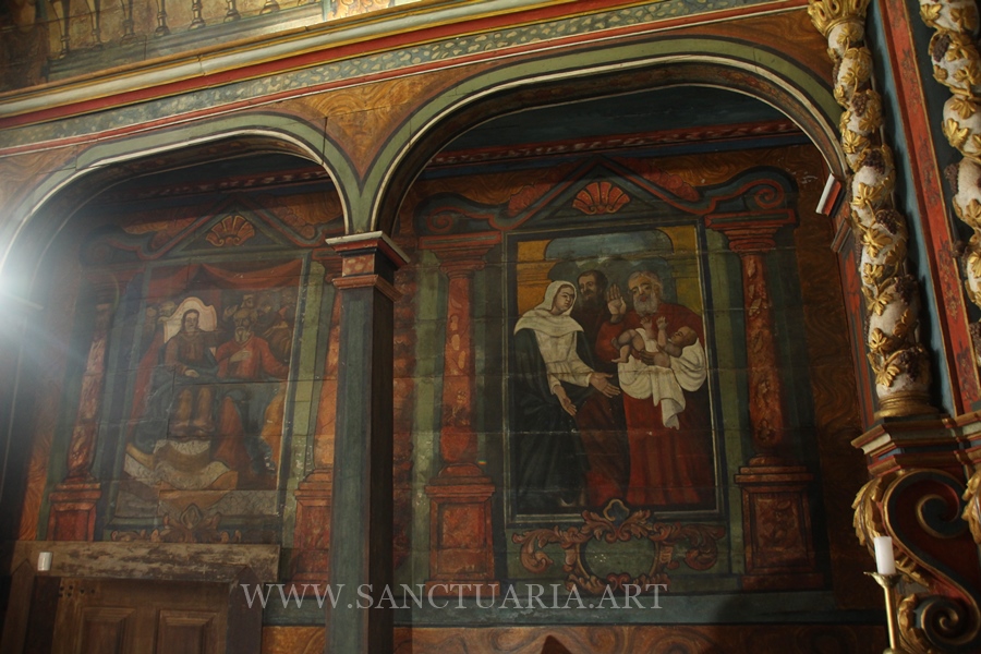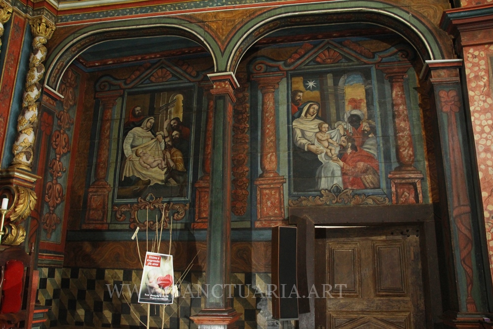 Detalhes de pinturas do arco cruzeiro: acima, a Fuga para o Egito, e abaixo, Nossa Senhora entrega o Rosário a São Domingos de Gusmão e Santa Rosa de Lima. Além destas, há também gravura ilustrando o sacrifício de Abraão.