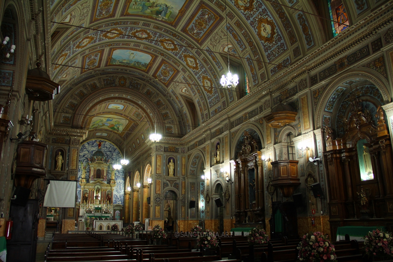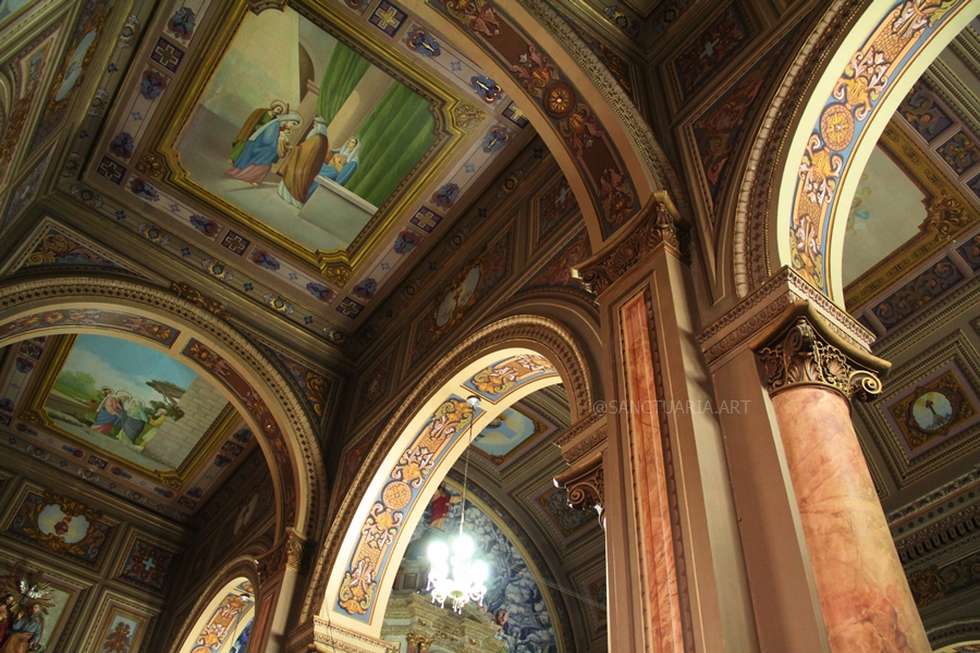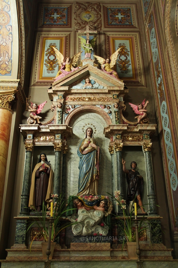 Acima, arcadas nas laterais do presbitério. Abaixo, retábulos neoclássicos do Sagrado Coração de Jesus e Imaculado Coração de Maria.