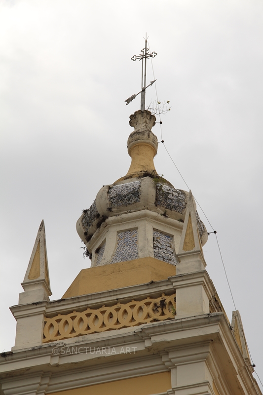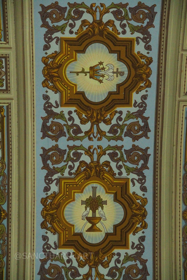 Acima, detalhe dos diversos símbolos que ornamentam o interior da igreja. Abaixo, a imagem da padroeira.