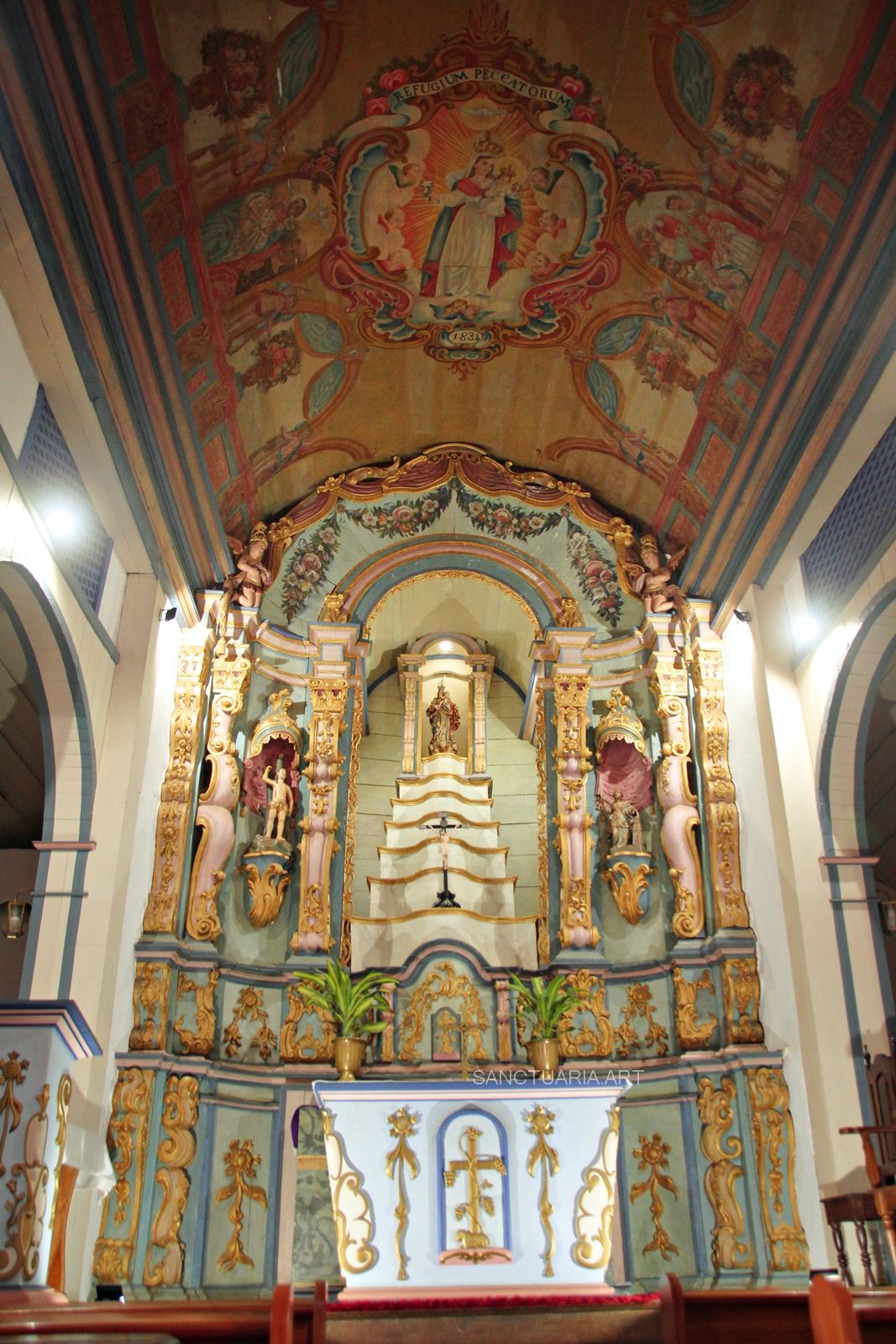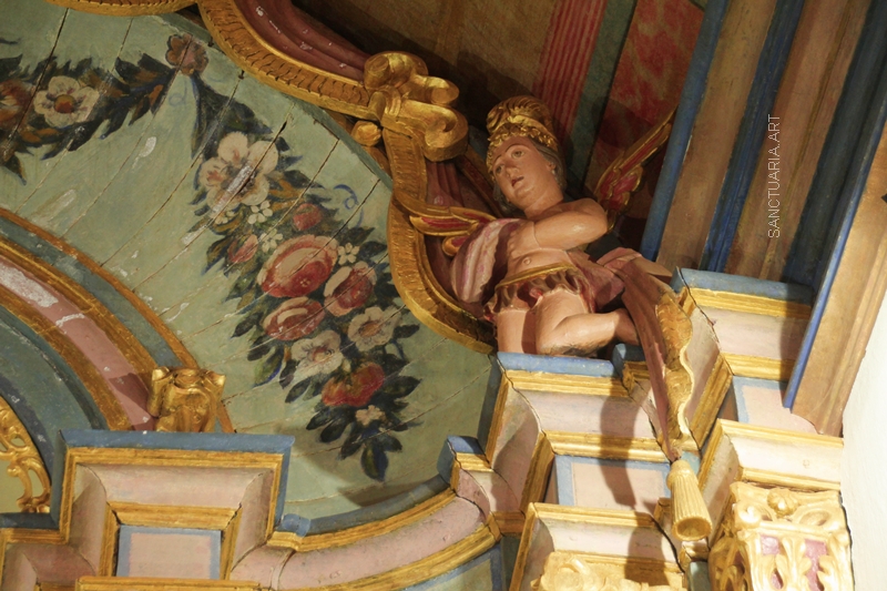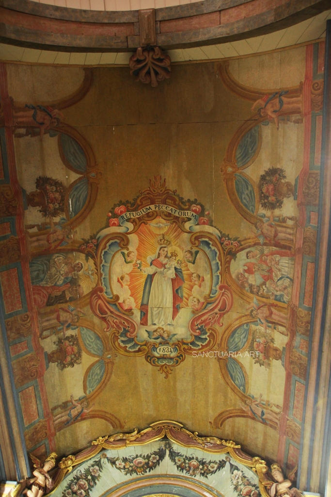 A pintura do forro da capela-mor retrata Nossa Senhora do Amparo com o Menino Jesus, segurando flores e pisando sobre nuvens. A imagem está inscrita em um medalhão central, com a data de 1834 claramente visível e acompanhada da expressão latina Refugium peccatorum, que significa “refúgio dos pecadores”.