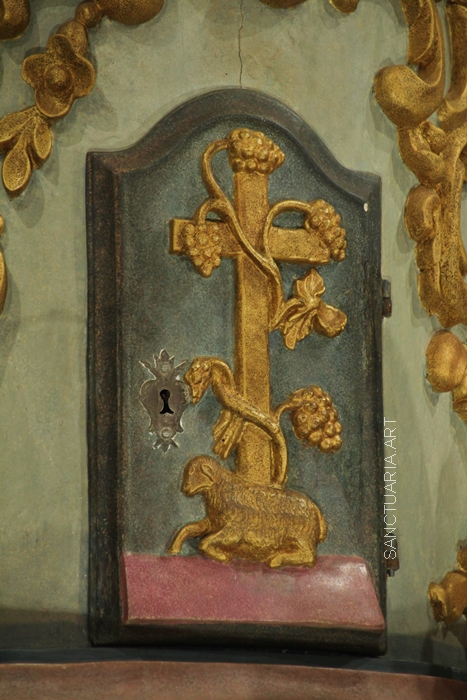 Abaixo, porta do sacrário com o Cordeiro, a Cruz e ramos de videira.